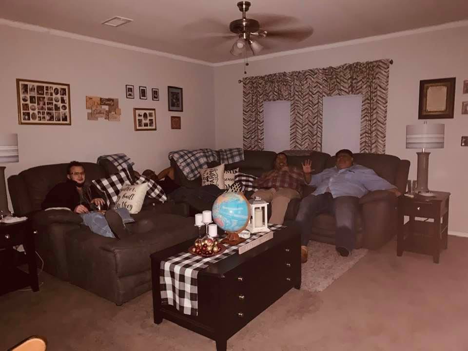 Below are the guys: Matt, DJ, Rock, and Jay in our living room this evening. It is nice to have a lot of laughter in our home.