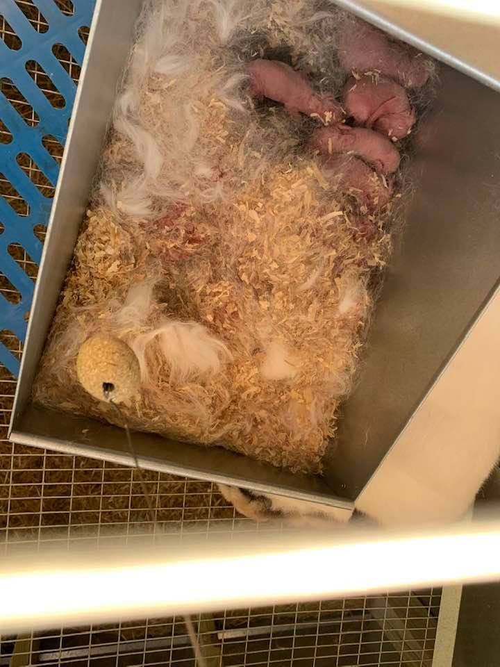 I went grocery shopping and animal feed shopping. After I got back, I went out to collect eggs. While I was out there, Matthew was checking on the rabbits because two of our females are due to deliver within the next couple of days. He called me to the rabbit hutch. One of our girls delivered at least seven pink babies. There could be more. This was the rabbit's first litter. The mama just laid there. Amazingly, she had them all inside the litter box like she was supposed to. Last time, the other female gave birth to seven babies and they all landed outside the cage.
